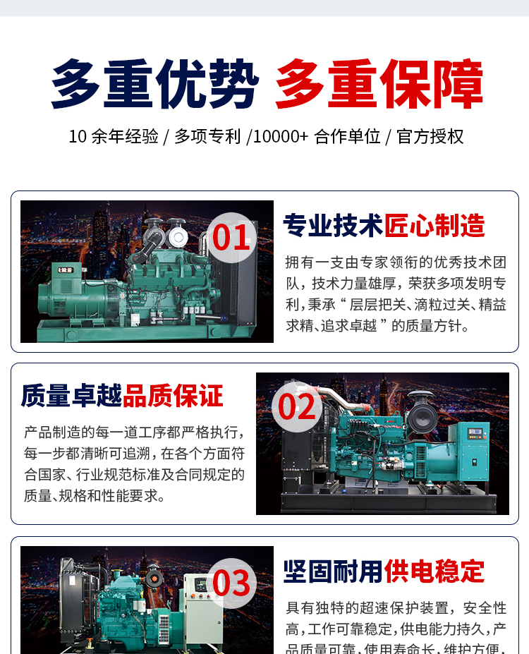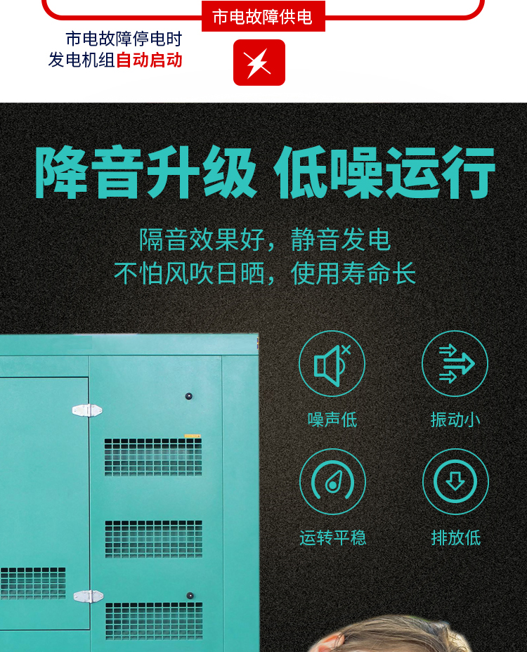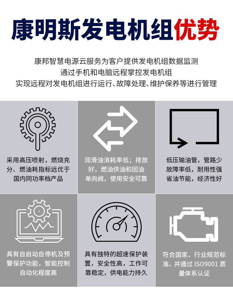 康邦可為不同行業(yè)提供30KW-3000KW不同規(guī)格、普通型、自動化、四保護、自動切換及三遙監(jiān)控、低噪音及移動式、自動化并網(wǎng)系統(tǒng)等特殊電力需求的柴油發(fā)電機組。